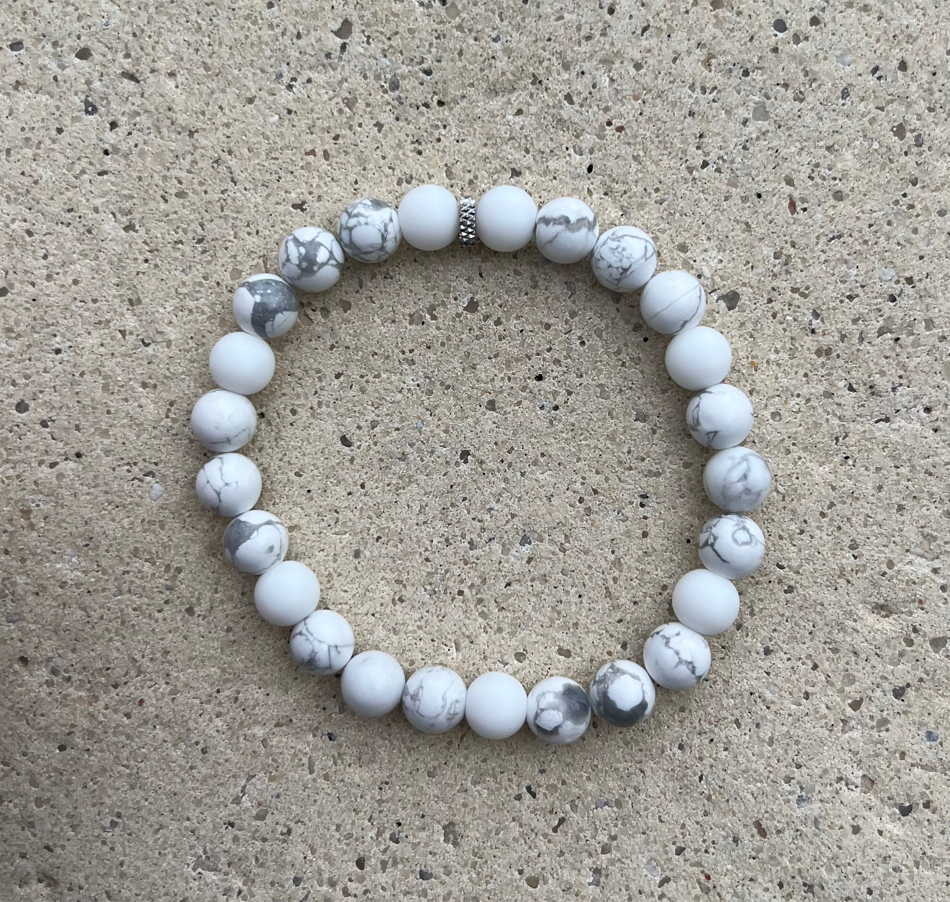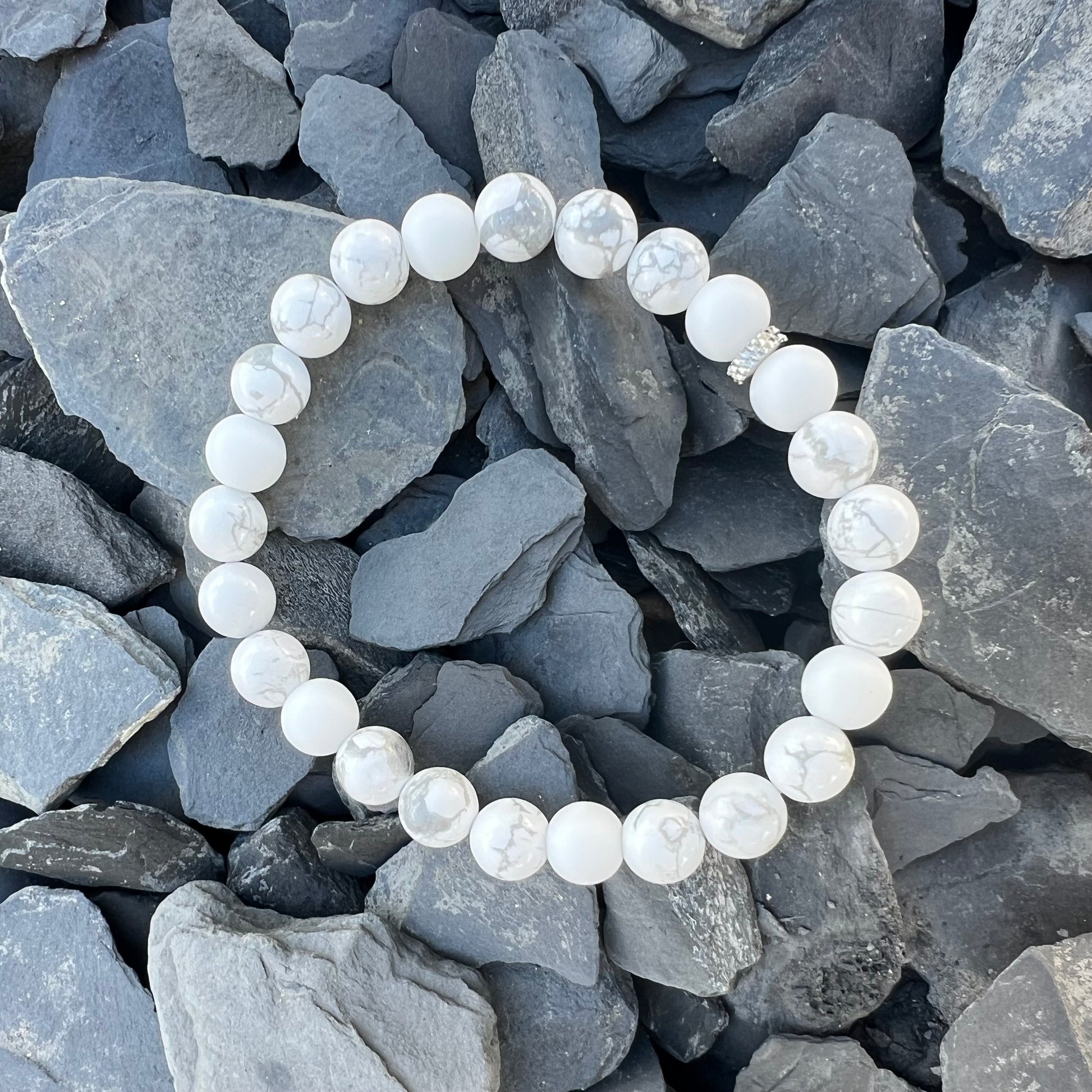 Le bracelet Blizzard combine des perles blanches marbrées de gris, pour un look lumineux et raffiné.
