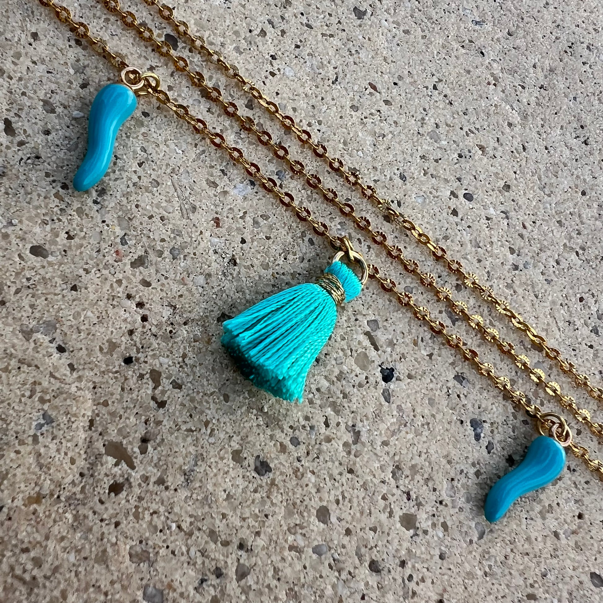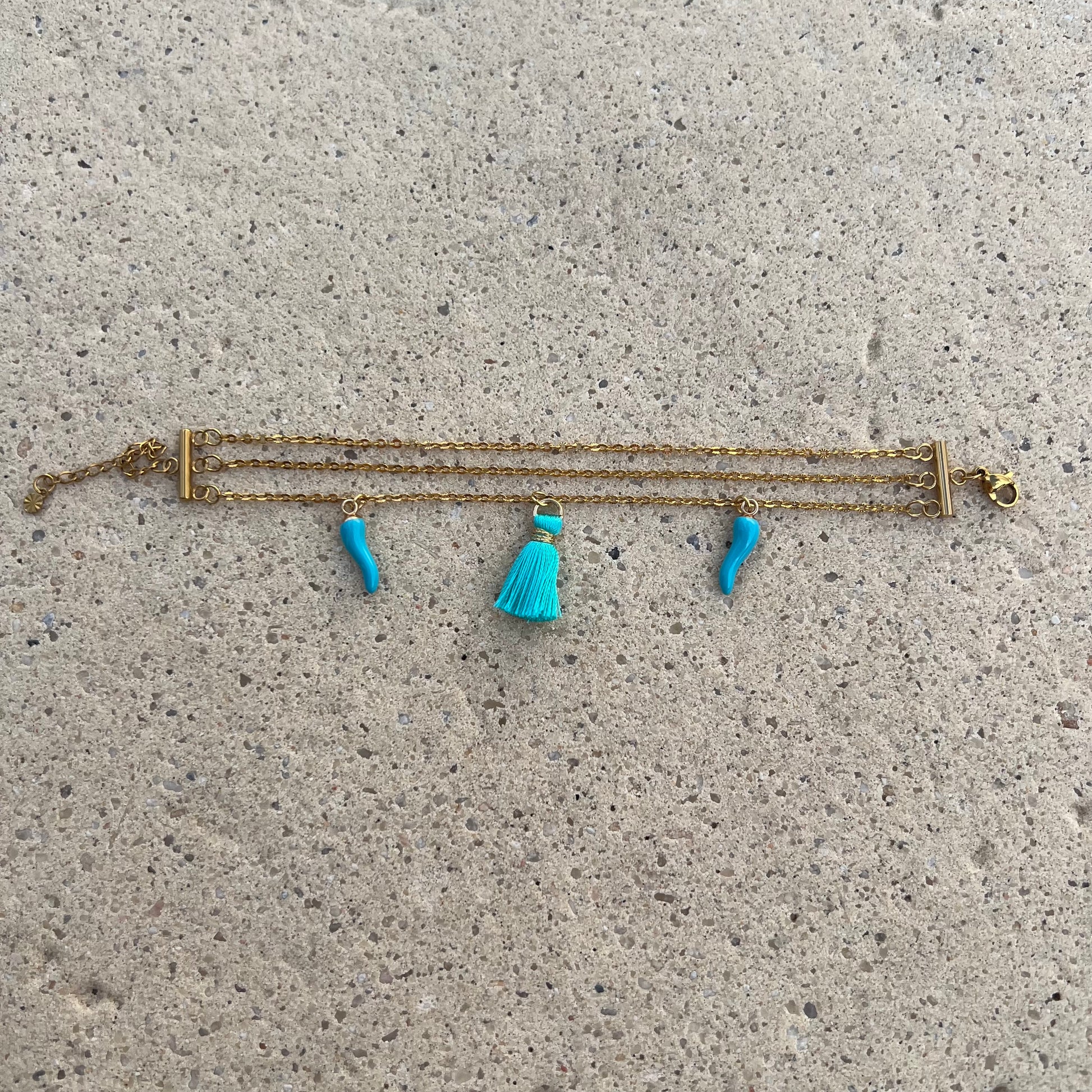 Alliance du doré et du turquoise, ce bracelet mêle éclat, fraîcheur et porte-bonheur.