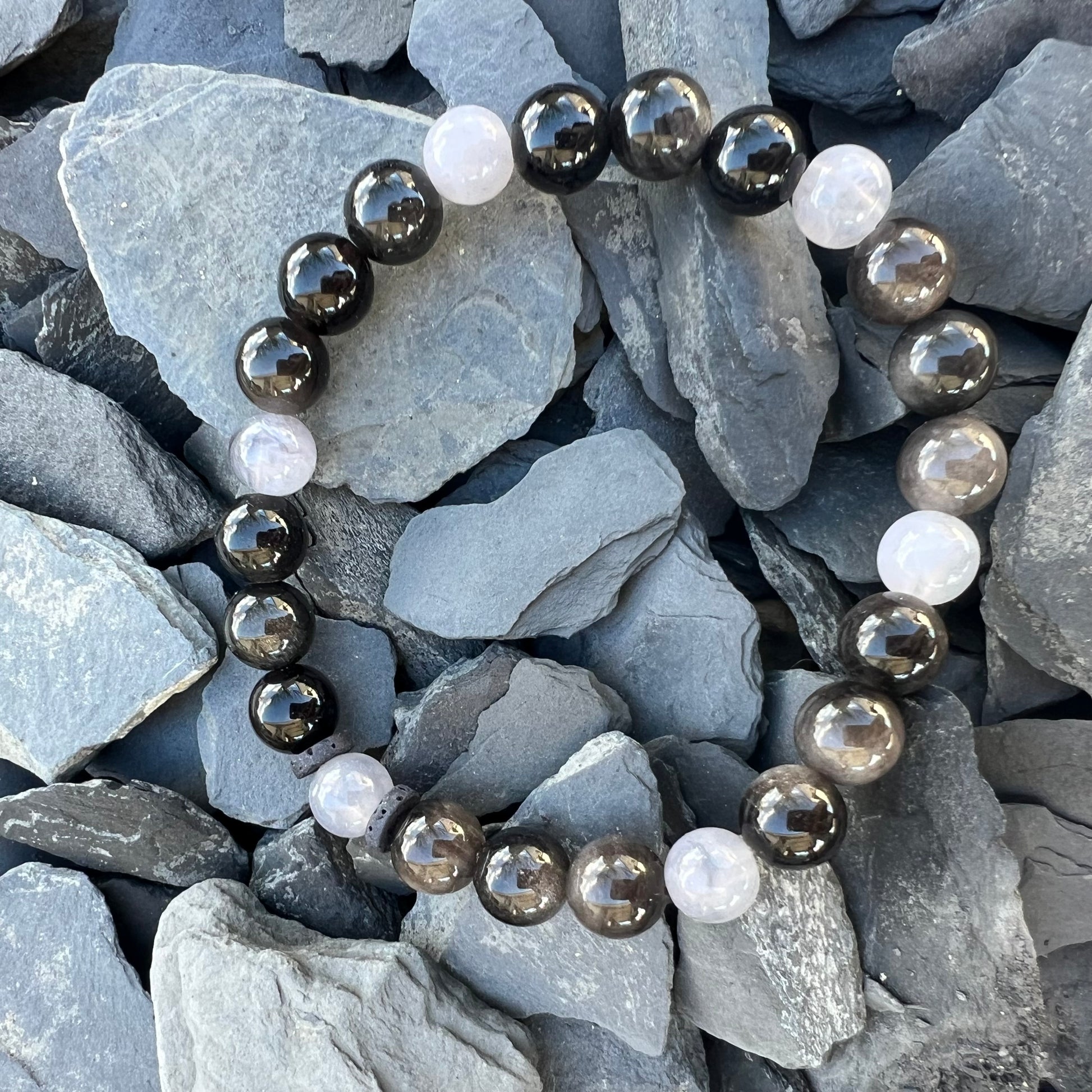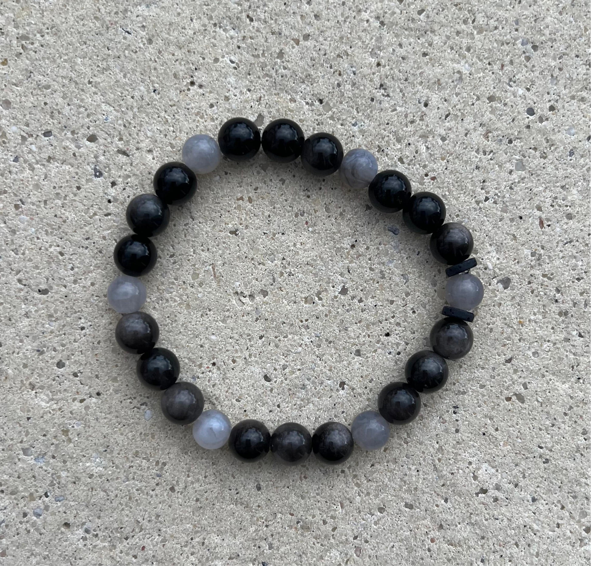 Le bracelet Storm associe des perles grises et noires au reflets gris, rappelant la puissance d’un ciel orageux.