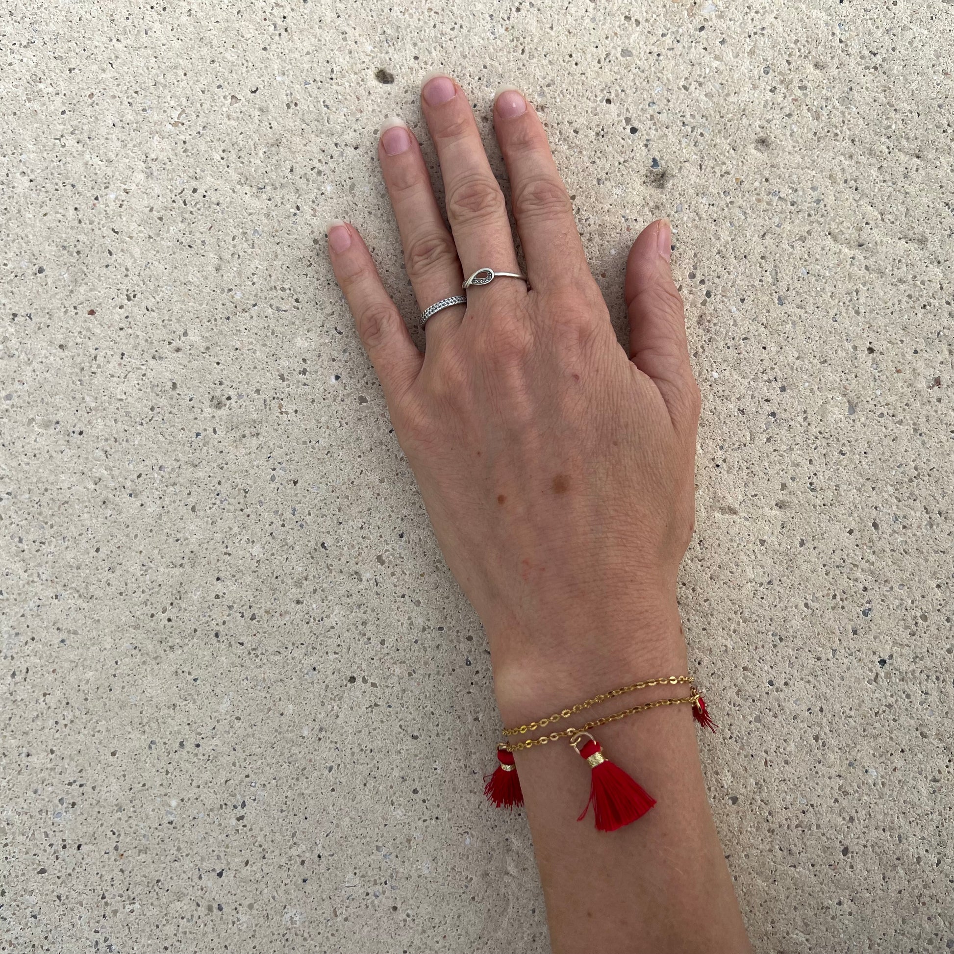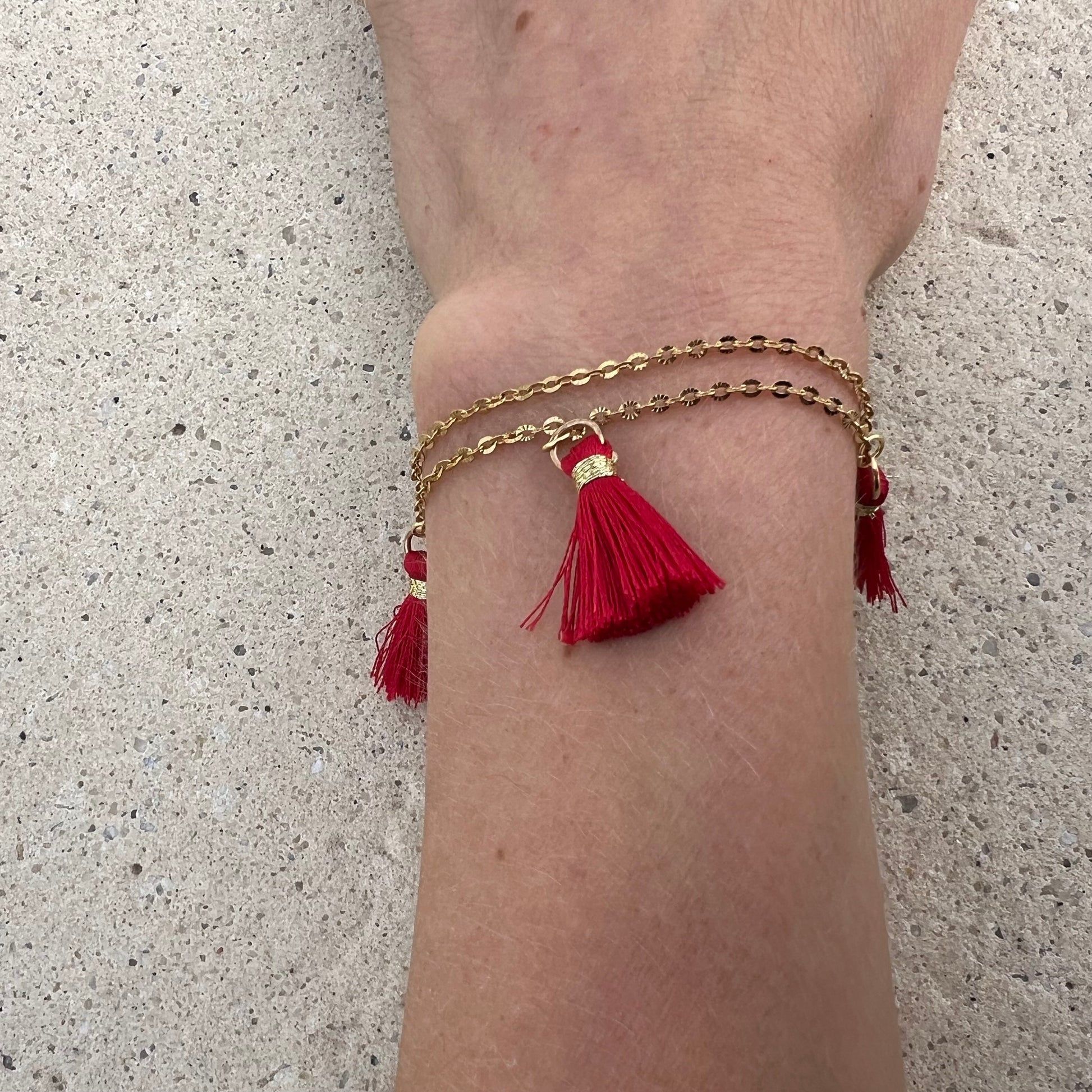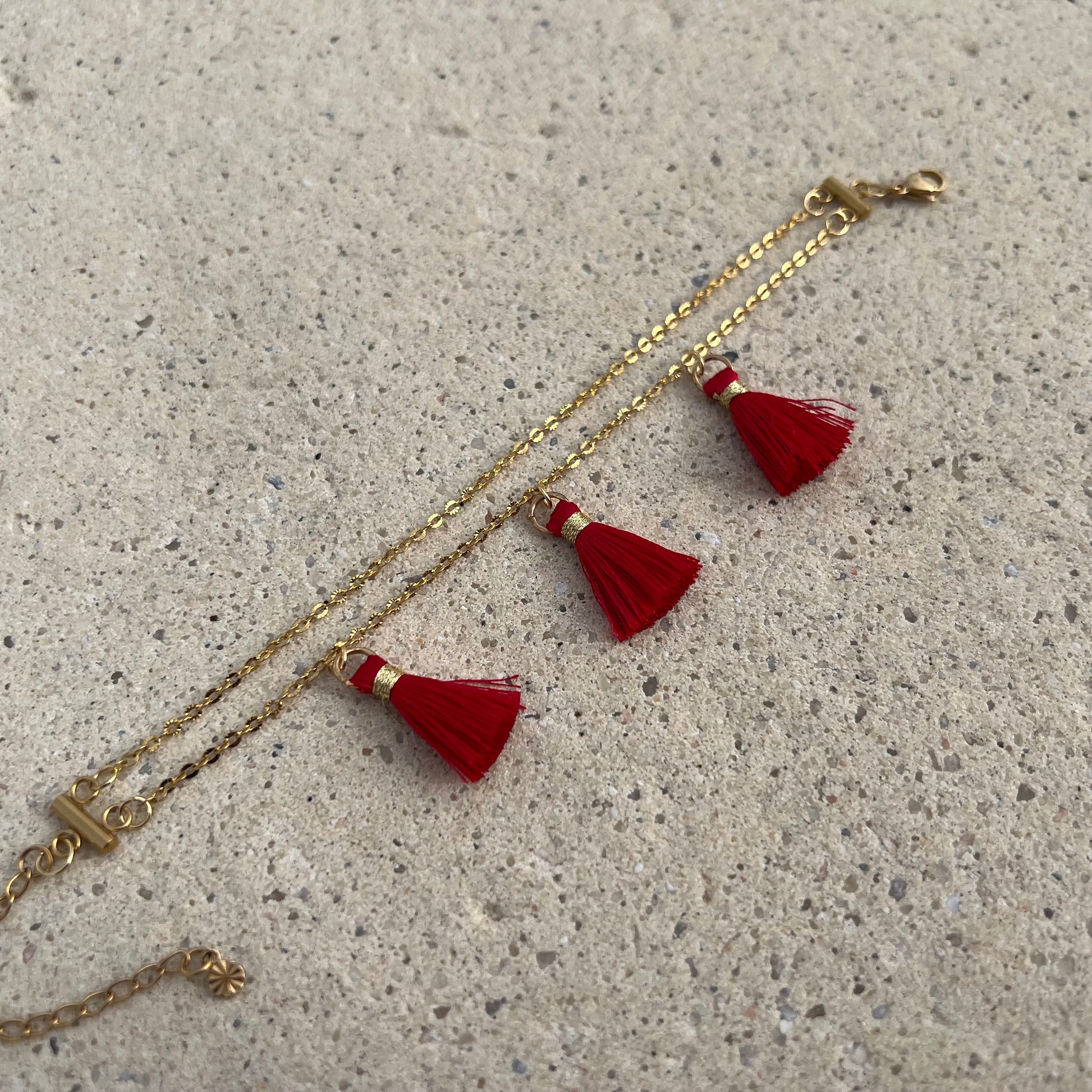 Deux chaînes fines s’entrelacent harmonieusement avec trois pompons colorés, créant un équilibre subtil entre raffinement et esprit libre.