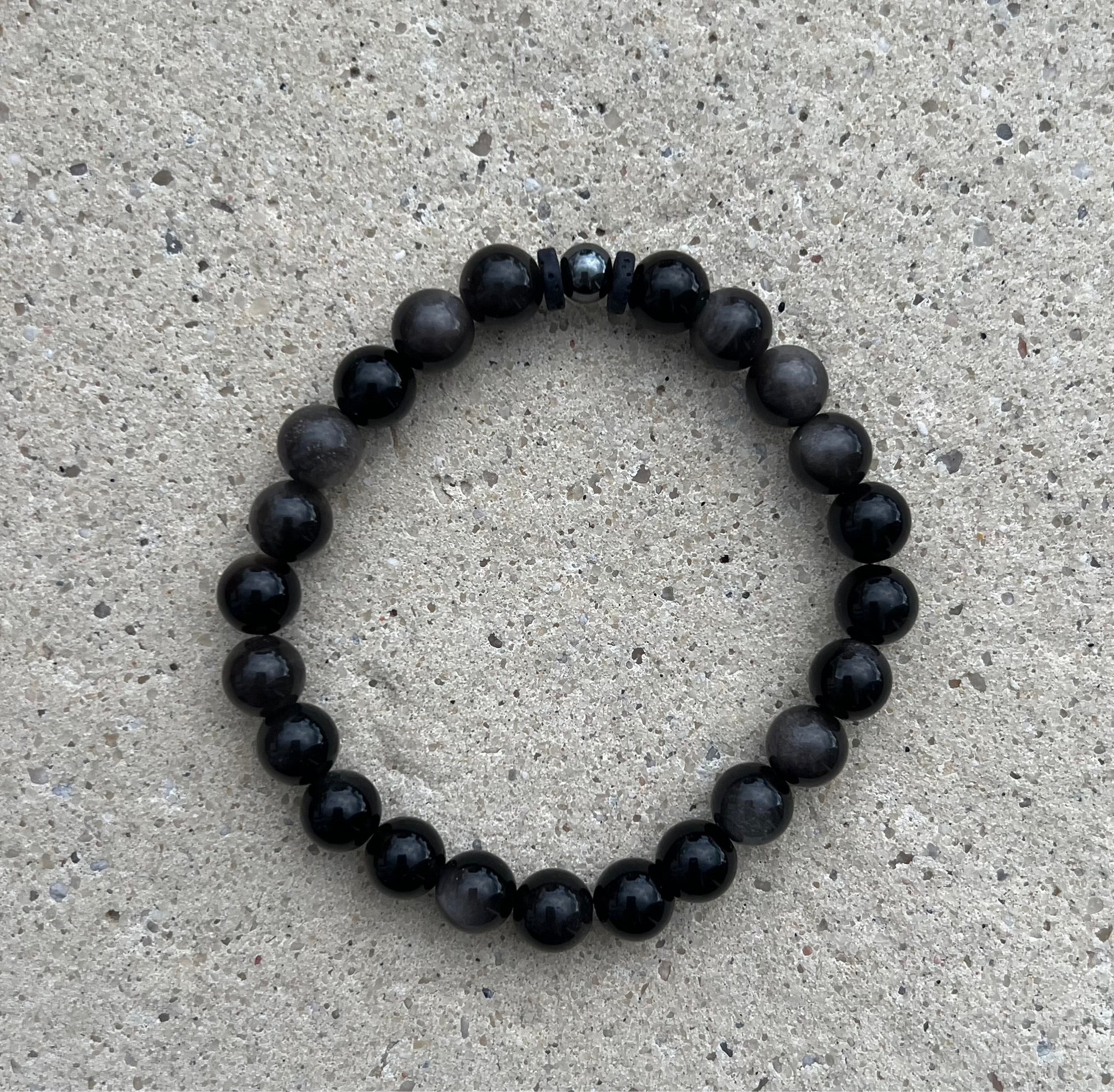 Le bracelet Obsidian présente des perles noires brillantes au reflet gris, minimalistes et élégantes.