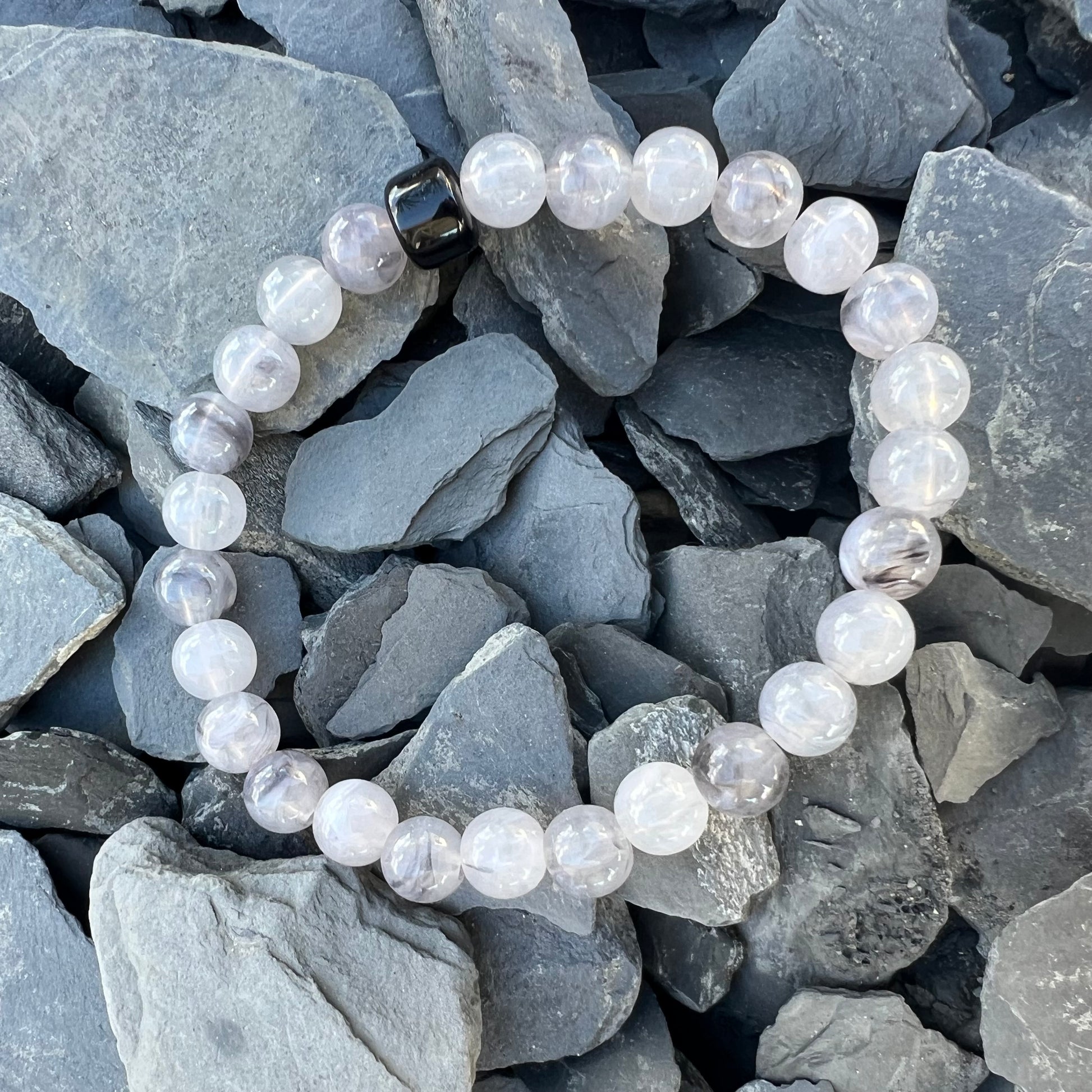 Le bracelet Stone mélange des perles transparentes gris clair et foncé, rappelant la force et la pureté des pierres naturelles.
